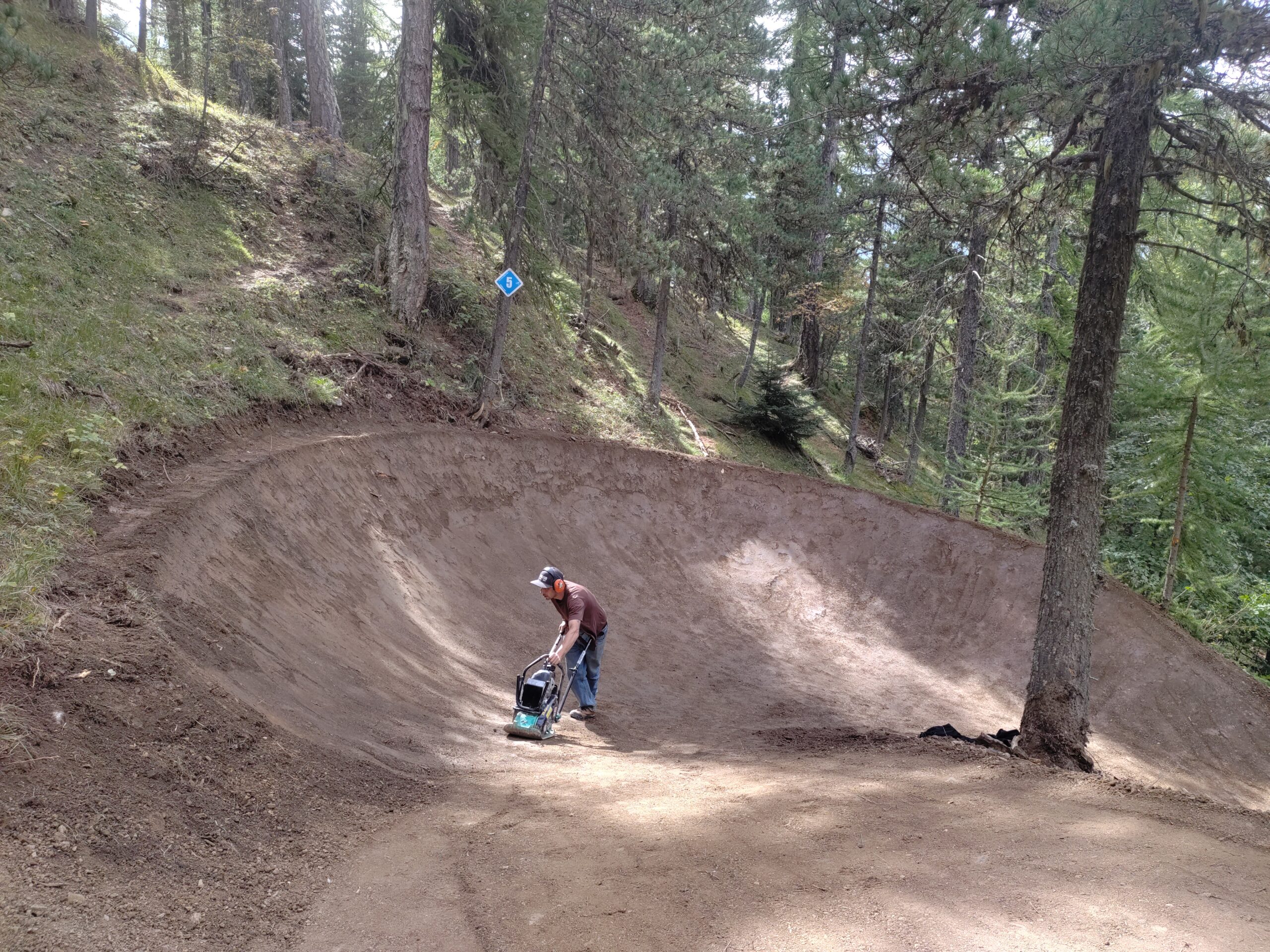Construction d’un pumptrack en montagne aux Arcs par l’entreprise Ride and Build, chantier estival d’aménagement VTT.